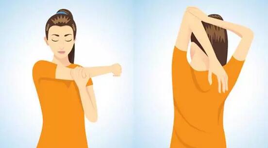 ?把一只胳膊完全向上举起,小臂放松,向后下方伸展10秒,换另一边做同样的动作。