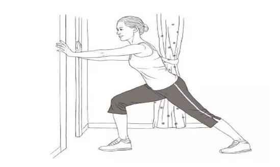 站在门口,双臂前伸,双手扶住门框两侧,右腿前弓,左腿后伸,成弓箭步,重心向前倾,在身体重量的协助下,双手向前推门框,此时即可感到肩部的肌肉被拉伸的感觉,保持这个姿势1分钟以上,然后休息片刻,换左腿前弓,右腿后伸的弓箭步,再推门框1分钟。